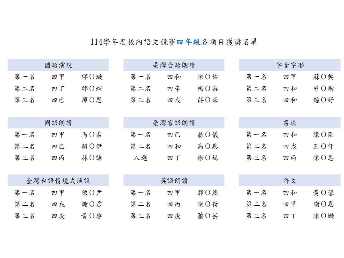 本校114學年度「校內語文競賽」四年級組獲獎名單如下: