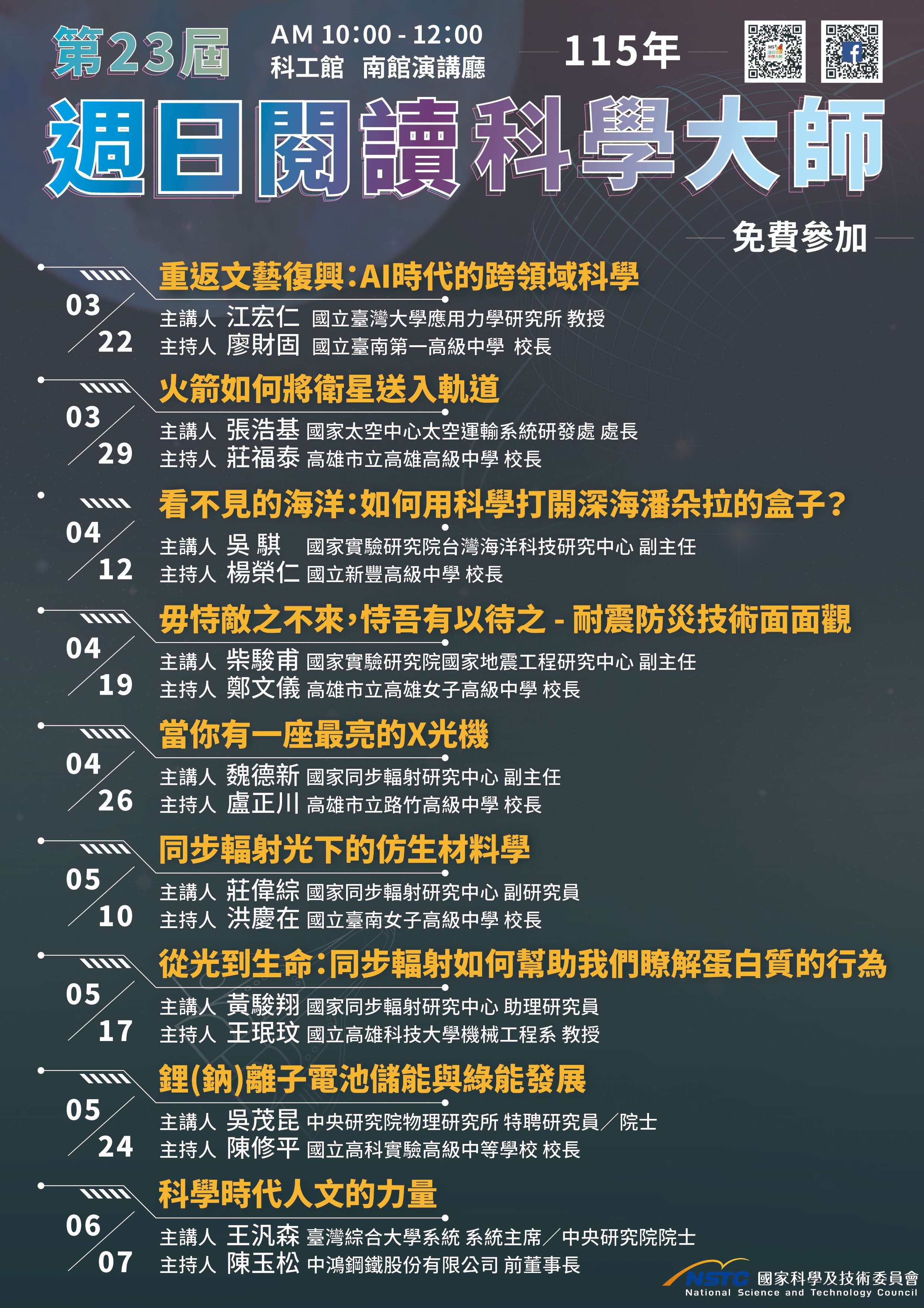 | 三、 | 講座詳細內容及報名方式等相關訊息可查閱官網演講,地點於國立科學工藝博物館南館演講廳,每場講座亦核發參加教師2小時研習時數,以及參加公務人員核予2小時進修時數,本講座亦提供現場直播,歡迎透過週日閱讀科學大師官網即時收播。 |
