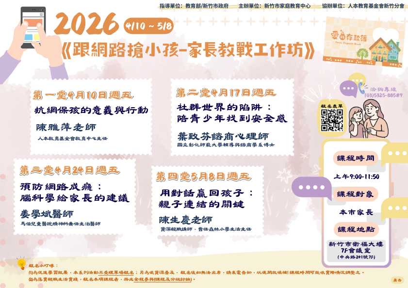 | 主旨: | 為促進家長理解如何預防孩子網路成癮,本中心定於4月10日起舉辦「跟網路搶小孩-家長教戰工作坊」系列,請貴校協助宣導,並鼓勵家長踴躍報名,請查照。 |