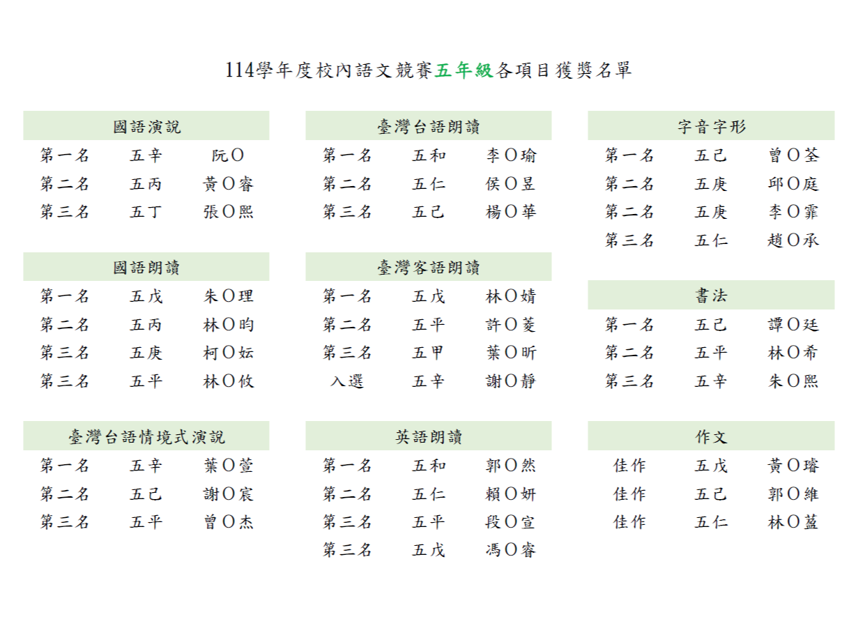 本校114學年度「校內語文競賽」五年級組獲獎名單如下: