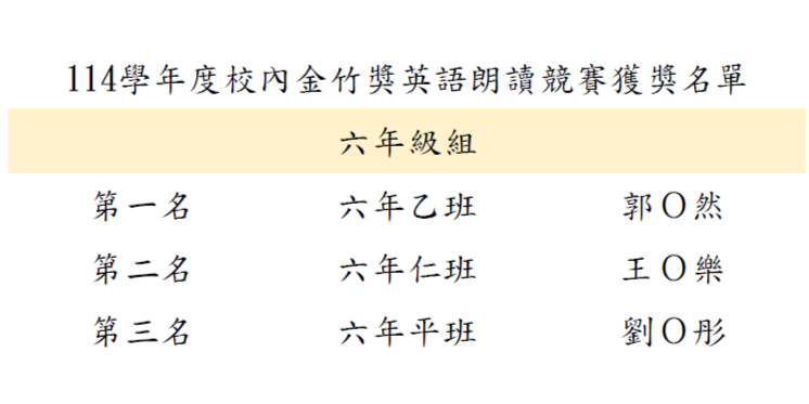 本校114學年度「校內金竹獎英語朗讀徵選」六年級組獲獎名單如下: