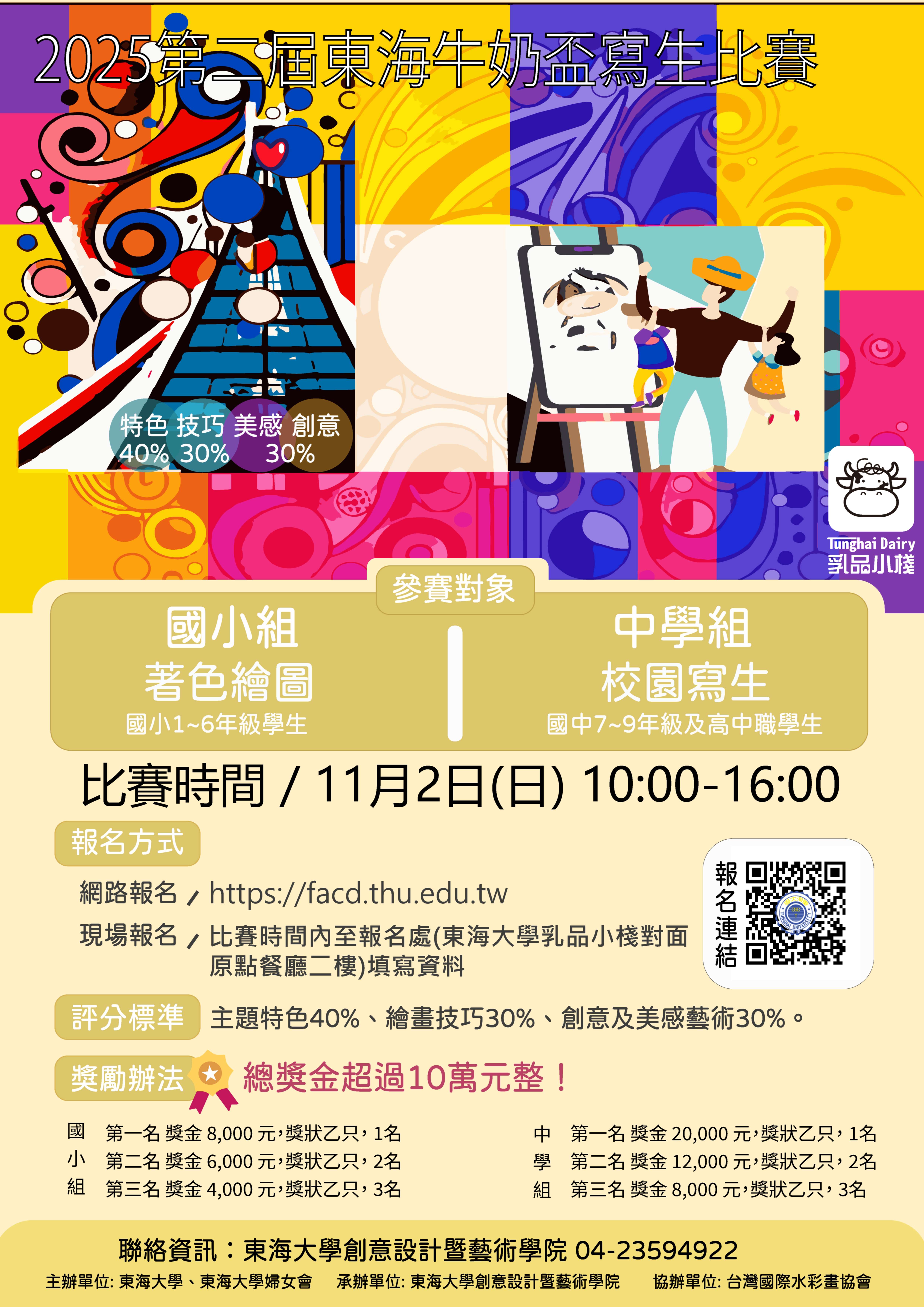 主旨: | 函轉東海大學舉辦「2025第二屆東海牛奶盃」寫生比賽活動海報乙份,請協助公告並鼓勵學生踴躍報名參賽,請查照。 |